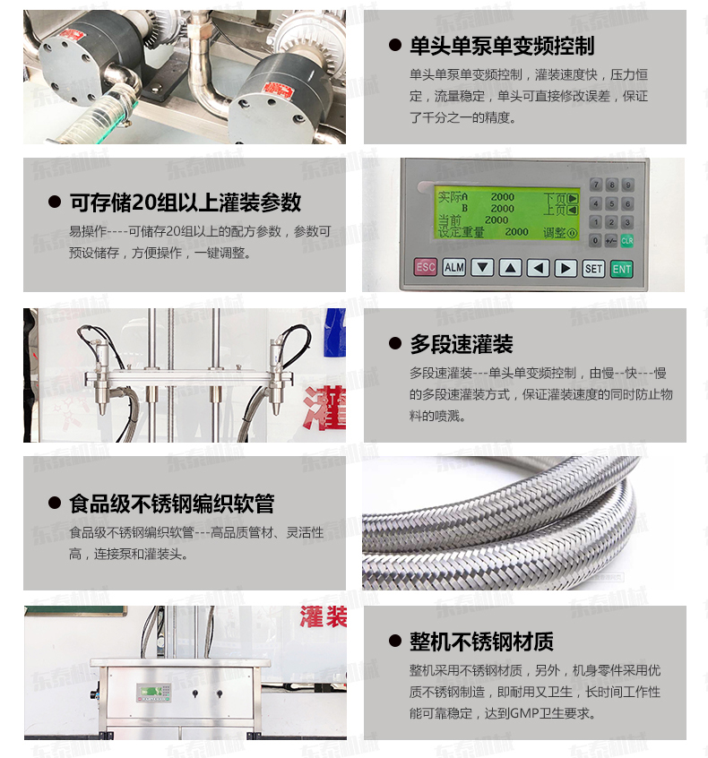 半自動(dòng)食用油灌裝機(jī)適用于各種食用油、潤滑油等粘液體的定量灌裝,如花生油,大豆油,菜籽油、香油,潤滑油等油類的灌裝。采用先進(jìn)的定量灌裝技術(shù),結(jié)合微電子智能控制技術(shù)單頭單變頻控制系統(tǒng),實(shí)現(xiàn)高精度、無級調(diào)速,操作簡單。各個(gè)灌裝頭可在一定范圍內(nèi)任意調(diào)節(jié)間距和灌裝量,可使用各種大小形狀的容器的灌裝。自動(dòng)化程度高。另外,機(jī)身零件采用優(yōu)質(zhì)不銹鋼制造,即耐用又衛(wèi)生,長時(shí)間工作性能可靠穩(wěn)定。達(dá)到GMP衛(wèi)生要求。本公司產(chǎn)品通過了IS9000質(zhì)量體系認(rèn)證。本設(shè)備經(jīng)久耐用,性能穩(wěn)定,是食用油、潤滑油等行業(yè)理想的灌裝設(shè)備。