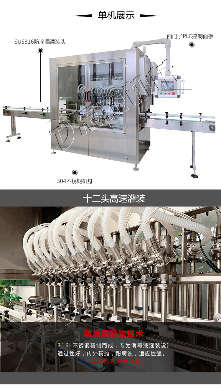 5、具有無瓶不灌裝、自動進瓶出瓶、自動定位灌裝、自動控制液位等功能,自動化程度高;灌裝嘴設計科學合理,配防滴漏裝置,灌裝不滴漏,擁有物料瓶及設備的干凈衛(wèi)生。