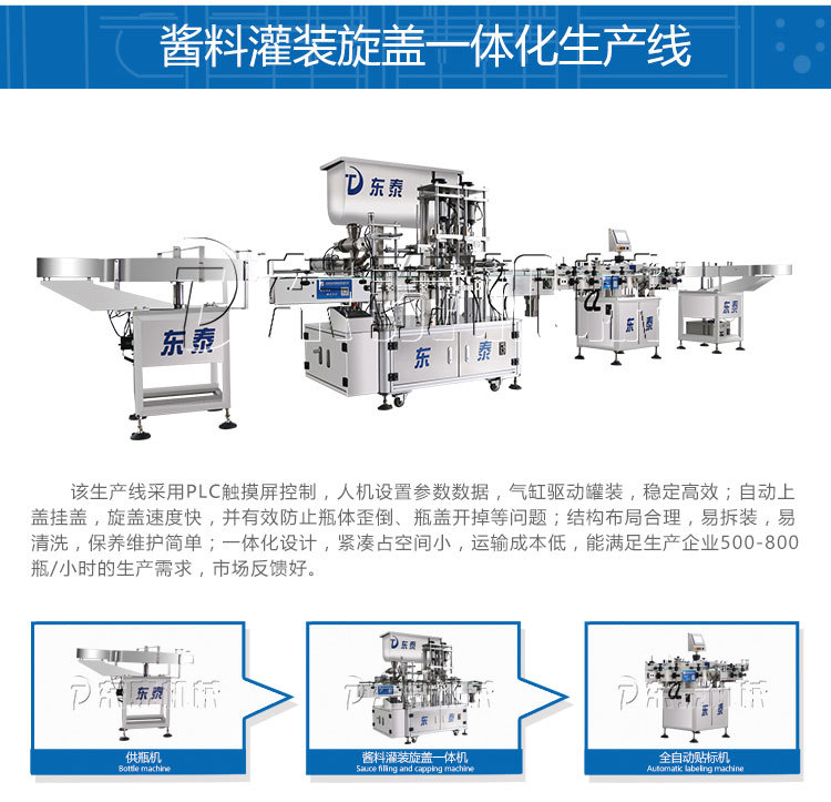 醬料的銷售情況直接關系到市場的發(fā)展,而醬料要想有一個好的銷量的話,就需要有好的質量作為保障的,而這個保障就是給予醬料好的灌裝效果,所以這也使自動化醬料灌裝機成為了各企業(yè)生產包裝的得力助手,能有效的完成灌裝任務,在規(guī)格化標準化中更加合理化,對各種醬料不僅起著保護的作用,還更為企業(yè)創(chuàng)造著更多的方便,正是因為我們東泰一直以來都是敢于挑戰(zhàn)、敢于創(chuàng)新和突破讓自己的實力在市場有了很大的進步,來推進醬料企業(yè)生產之后,從而帶來各個領域的快速的發(fā)展。