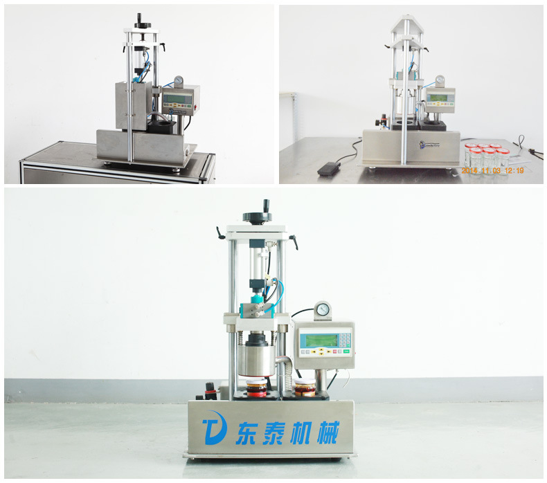 ZK-F2V型半自動(dòng)玻璃瓶真空封口機(jī)由機(jī)架、上模、下模、旋轉(zhuǎn)定位系統(tǒng)、旋蓋結(jié)構(gòu)、真空系統(tǒng)、電氣壓力控制系統(tǒng)等組成。工作方式是將帶蓋的玻璃放入下模,然后機(jī)器會(huì)自動(dòng)用真空封蓋。
